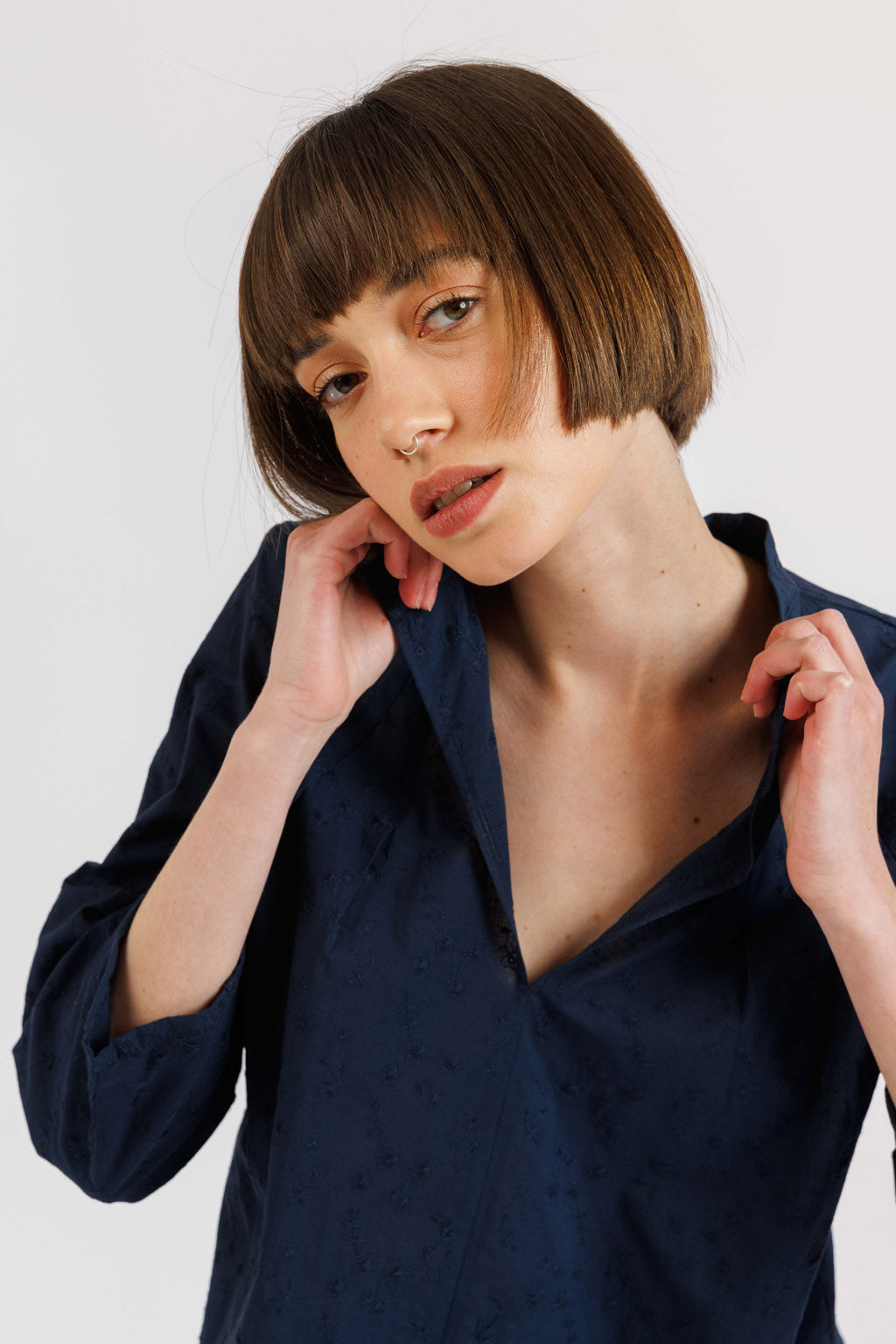 חולצה קלושית, בעלת בעלת מפתח וי וצווארון סיני, שרוולים תפוחים באורך 7/8.